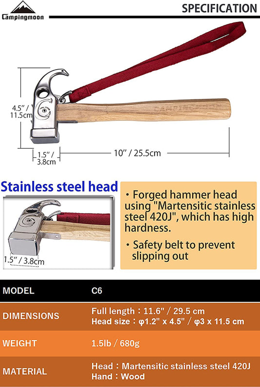 CAMPINGMOON Stainless Steel Camping Hammer Portable Lightweight Multipurpose Peg Stakes Ground Nail Hammer Tent Survial Tool Wooden Wood Mallet Outdoor Camping Hiking Travel Heavy Duty Camping Moon