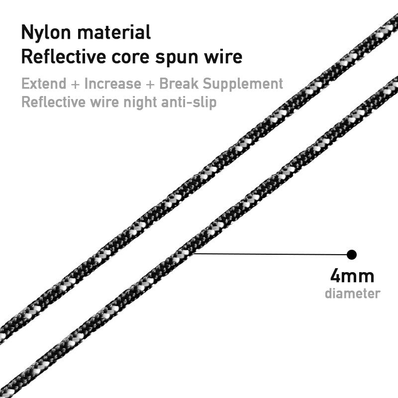 Inclusions: 8pcs of 4m Reflective Nylon String with 8pcs Black Aluminum Tensioner Buckle