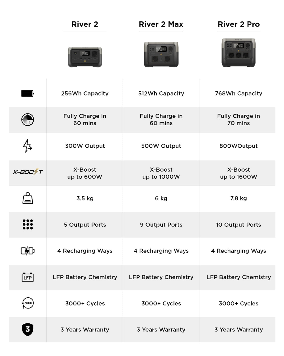 Long-lasting LFP (lithium iron phosphate) battery: Charge the River 2 with its LFP battery cells over 3000 times before their capacity drops to 80%. This corresponds to almost 10 years of regular use. The River 2 features advanced BMS (battery management system) protection that monitors voltage, current and temperature so your LFP battery lasts for years