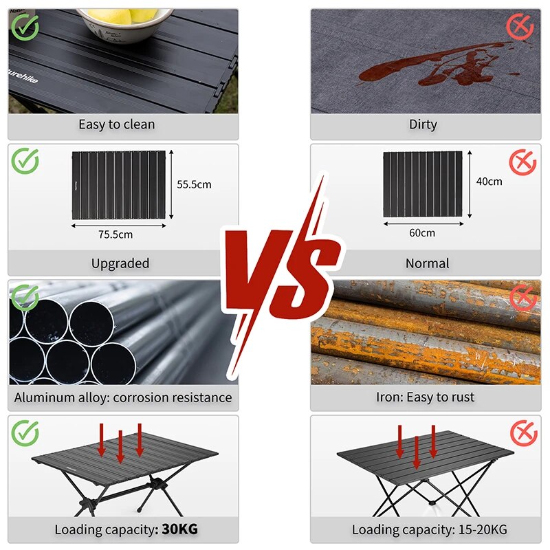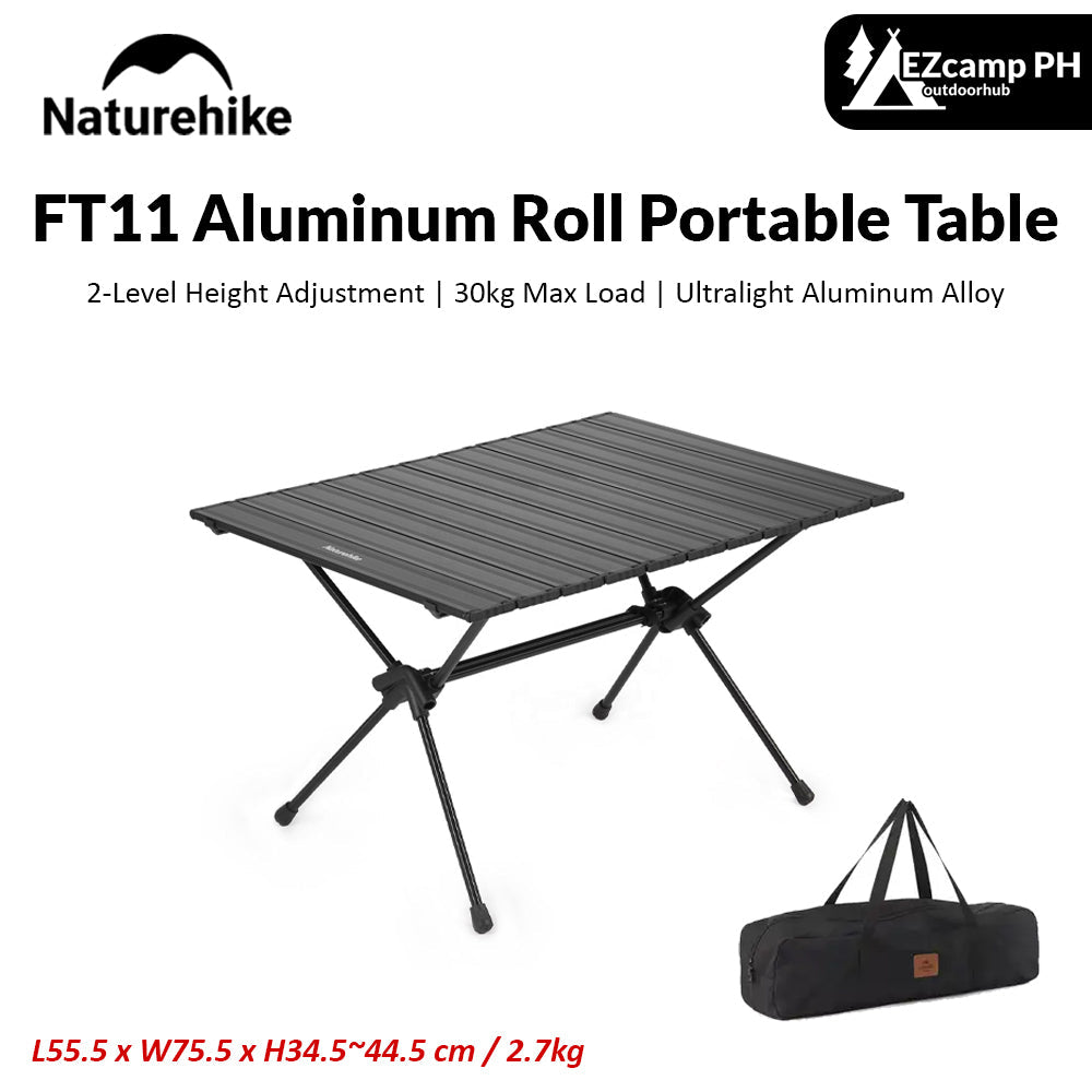 Brand: Naturehike Model Number: CNH22JU037 Product Name: FT11 Aluminum Alloy Egg Roll Portable Folding Table Material: Aluminum Alloy Comes with Storage bag Max Load for up to 30kg Size: 55.5 x 75.5 x 34.5~44.5 cm Weight 2.7kg Storage Size: 14 x 13 x 60 cm Color: Black