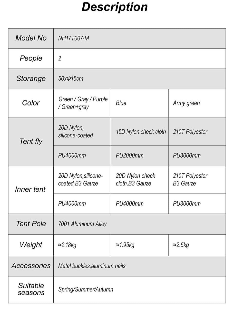 Outer Tent: 15D Nylon Plaid / Waterproof 2000mm