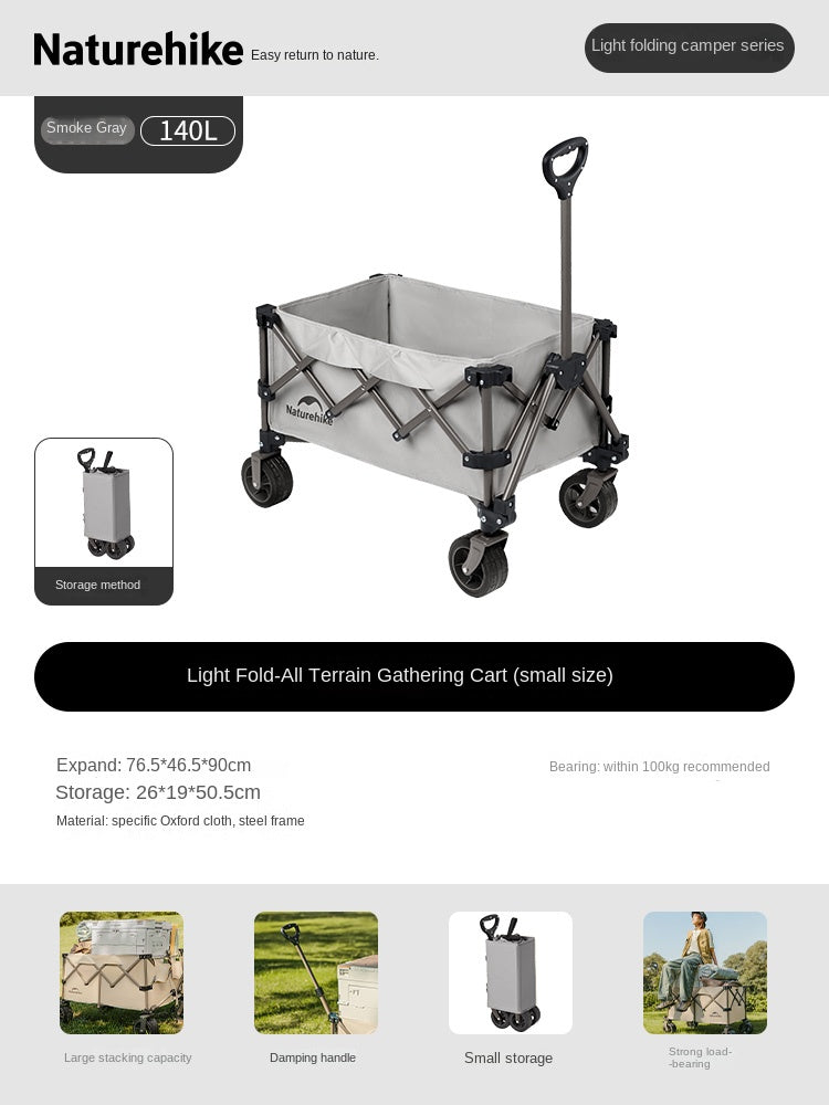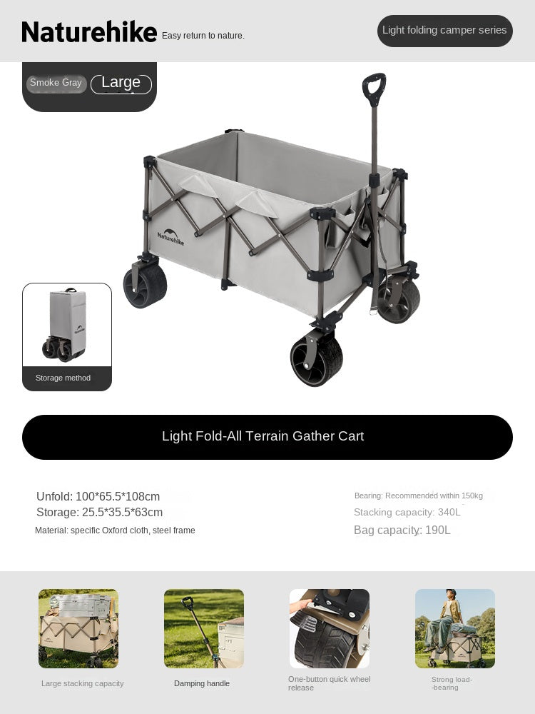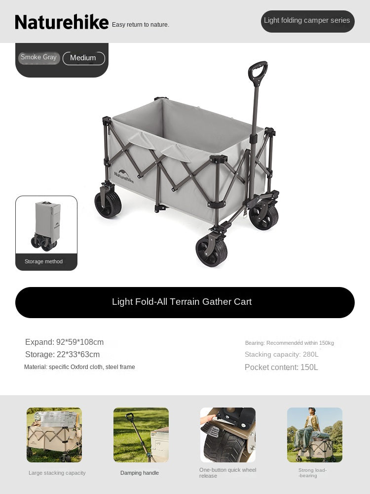 Naturehike Multi-Terrain Gathering Cart Multifunction Foldable Camping Trolley Large Capacity Outdoor Cart Wagon Collapsible 360°