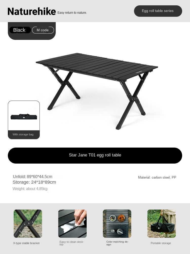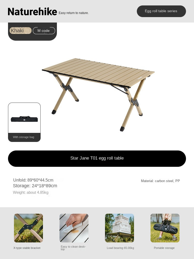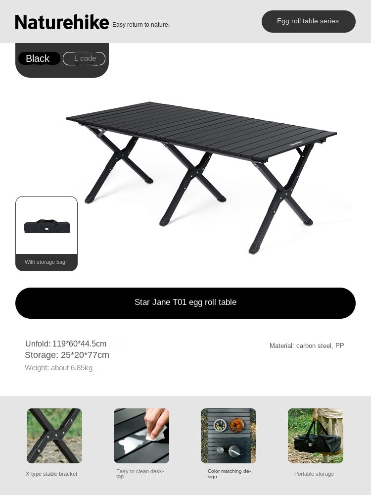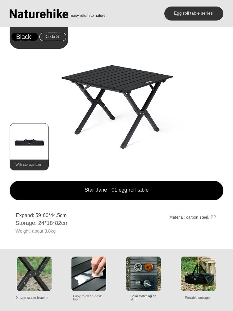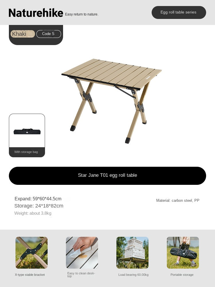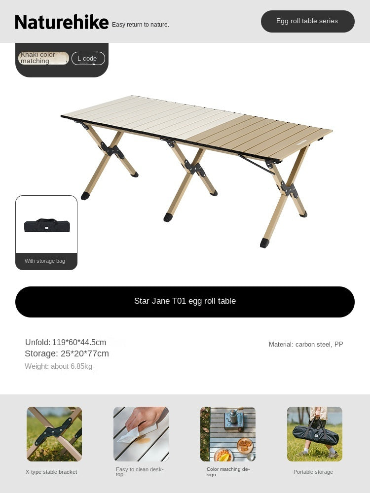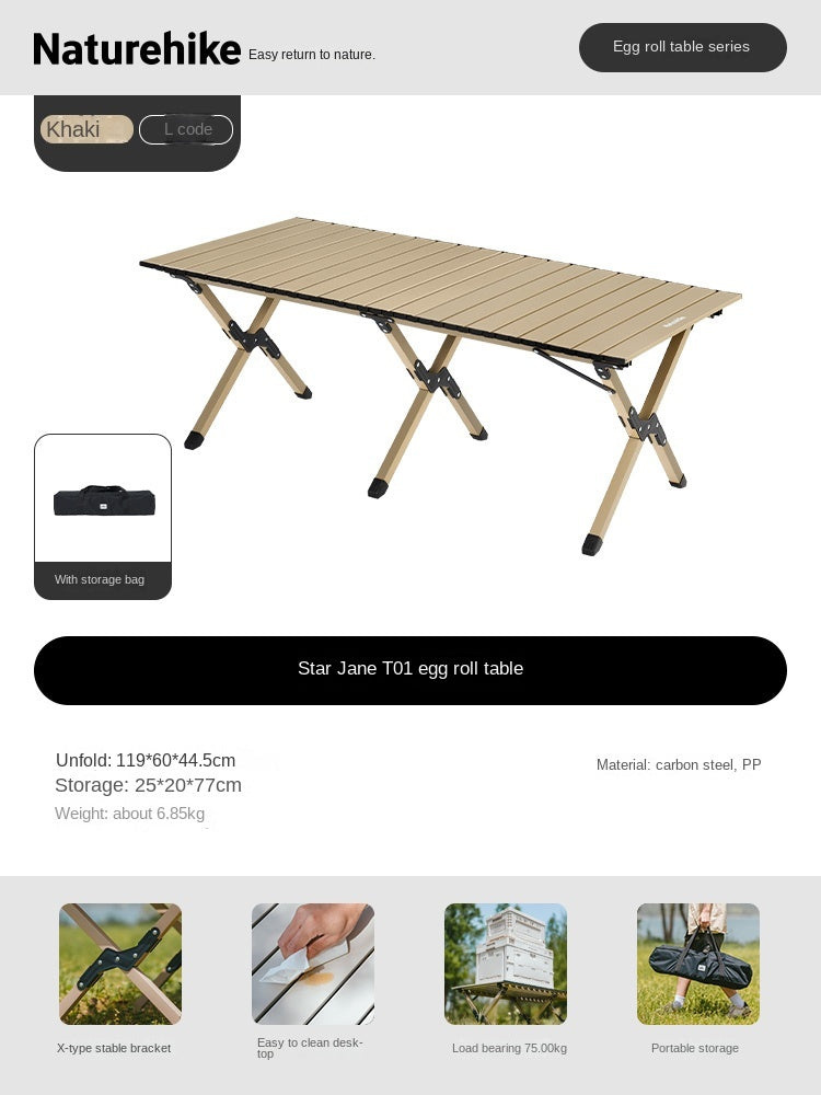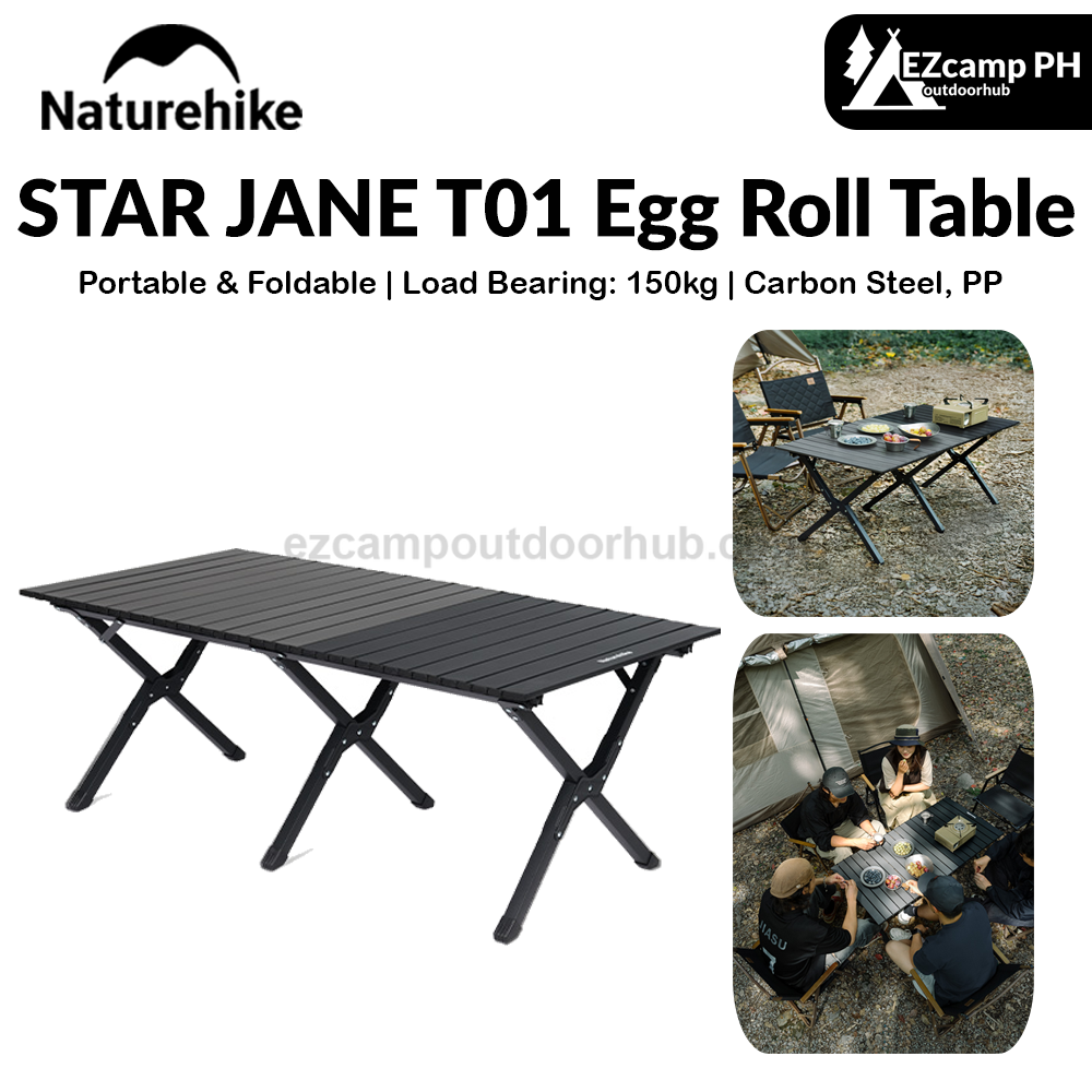 Naturehike STAR JANE T01 Egg Roll Table Portable Foldable Small Medium Large Sizes 150kg Max Load Folding Table Carbon Steel Black Khaki Carbon Steel Heavy Duty