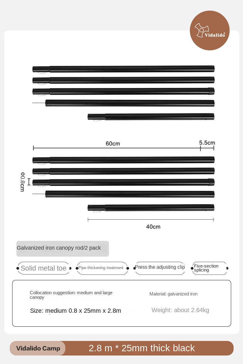 Vidalido Galvanized Iron Canopy Rod Black Steel Iron Awning Pole Tarp Tent 1.8m 2.2m 2.4m 2.8m Length 3-4 Section 2pcs Per Set Camping Accessories Rod